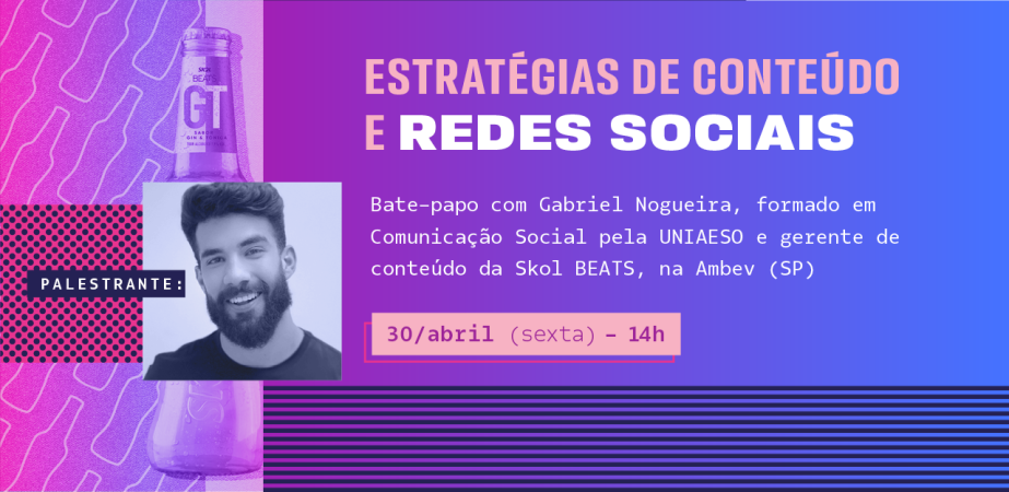 A notoriedade dos ex-alunos do Centro Universitário AESO-Barros Melo - UNIAESO, no mercado de trabalho, é um fator de grande orgulho para a instituição. Visando a aproximação deles na formação dos atuais estudantes da graduação, o curso de Publicidade e Propaganda convidou Gabriel Nogueira, Gerente de Conteúdo da Skol BEATS, para palestra. O encontro acontece dia 30/04, às 14h, via