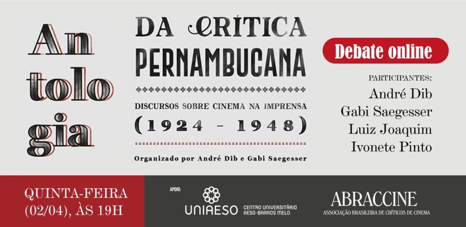 Nesta quinta-feira, dia 02 de abril, os organizadores participam de debate online, mediado pelo crítico e professor do Centro Universitário AESO Barros Melo – UNIAESO e também vice-presidente da Abraccine, Luiz Joaquim, com os outros críticos Ivonete Pinto, presidente da Abraccine, e Paulo Henrique Silva, de Minas Gerais. A conversa acontece às 19h, pelo Google Meet,  e marca o lançamento do livro. Além do Antologia da crítica pernambucana, estará em pauta o tema “Crítica e Memória”. Uma vez concluído o debate, o link da gravação do bate-papo estará disponível no site da Abraccine (www.abraccine.org).